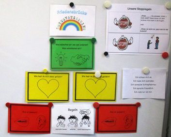 Die Stoppregeln sind sichtbar in den Klassenräumen und im Eingangsbereich der Schule visualisiert, um die Kinder täglich an ihren Gebrauch zu erinnern.